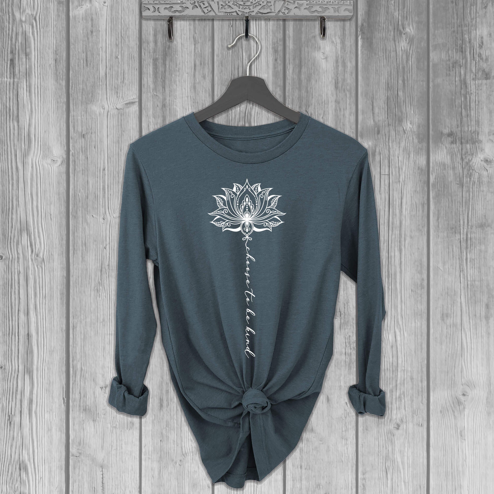 Women's Bella Relaxed Fit Long-Sleeve Tee with a lotus flower and positive saying choose to be kind graphic screen-printed design, and ultra-soft, comfy fabric.