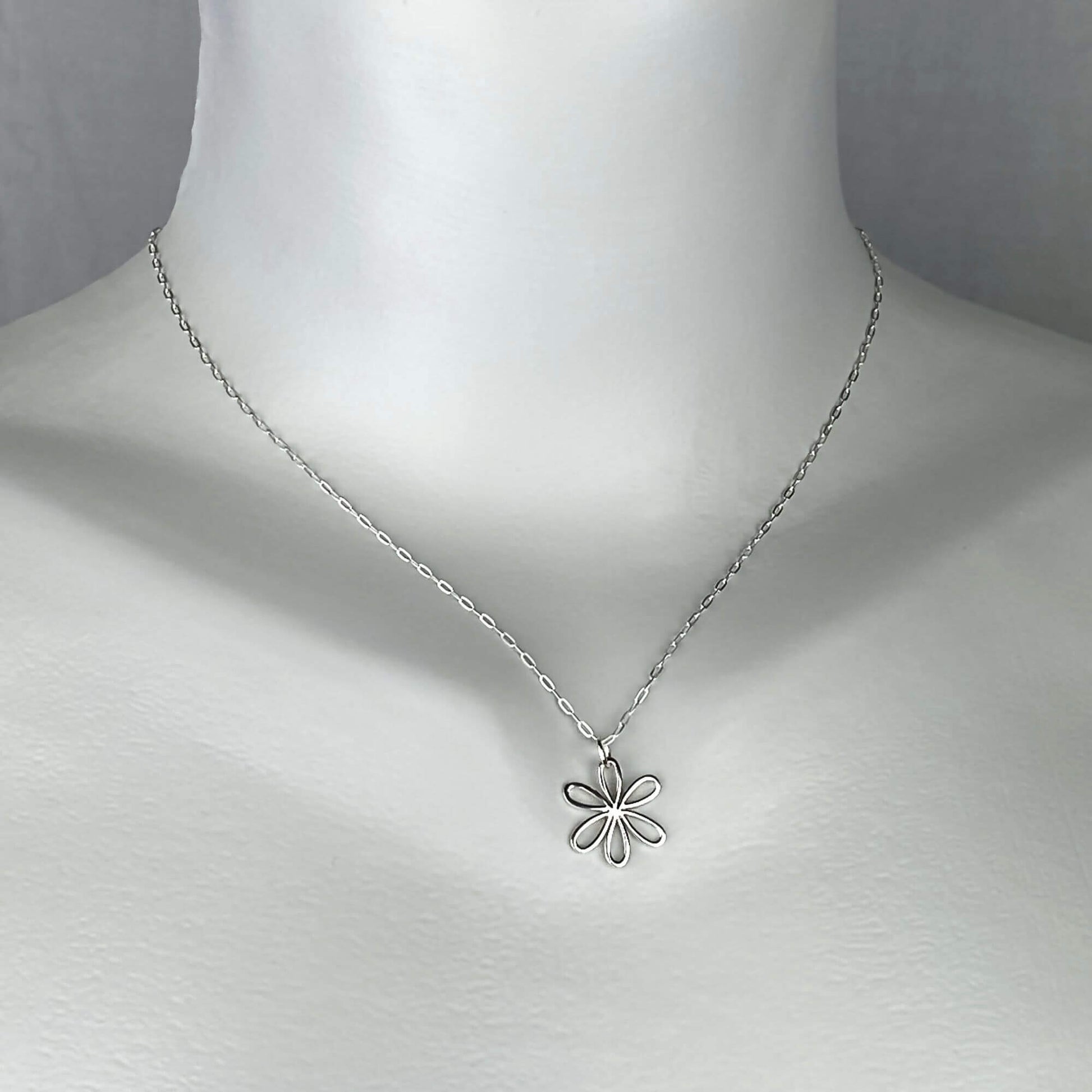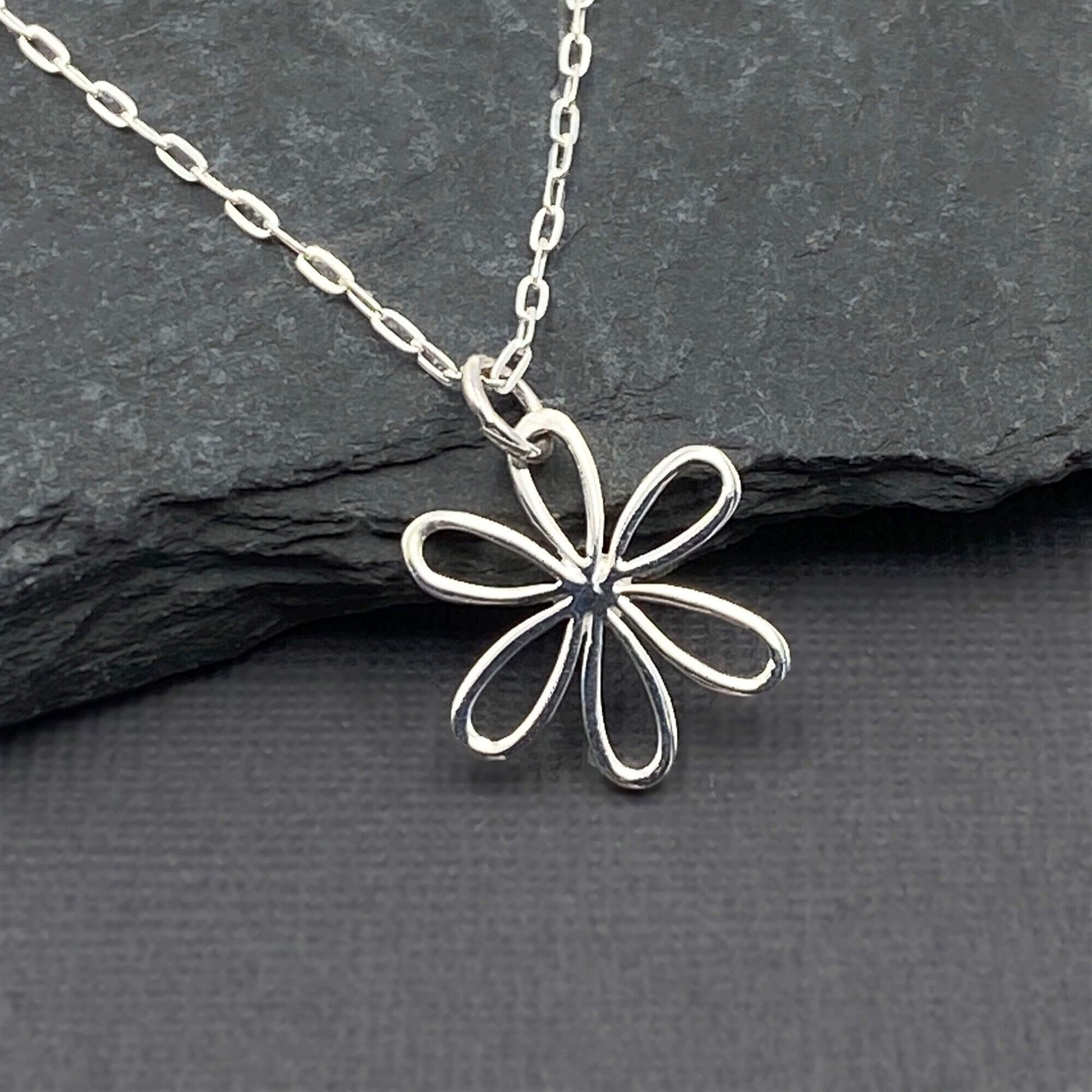 925 Solid sterling silver tiny Daisy charm necklace on a 925 solid sterling silver chain. Choose your chain style, length, or charm-only option. The meaning of Daisies symbolizes innocence and purity in Celtic legends. This sweet, tiny flower necklace is great for a minimalist look or for girls.
