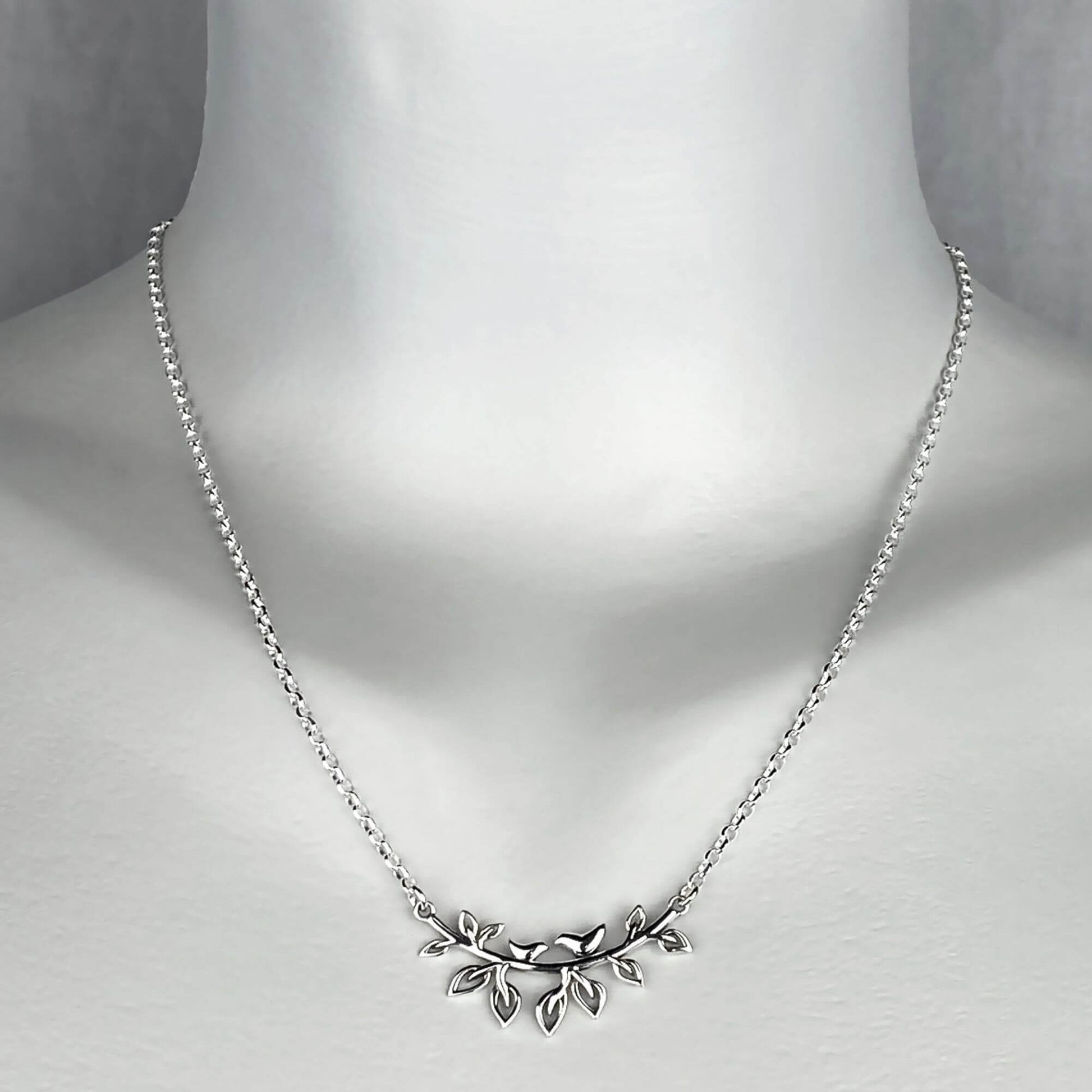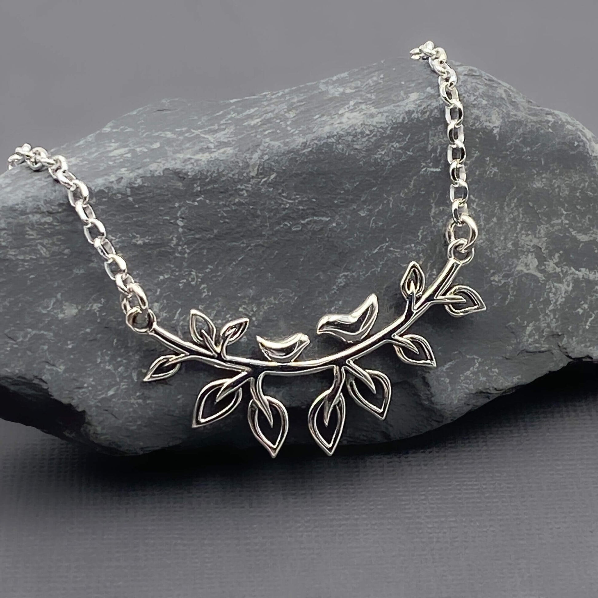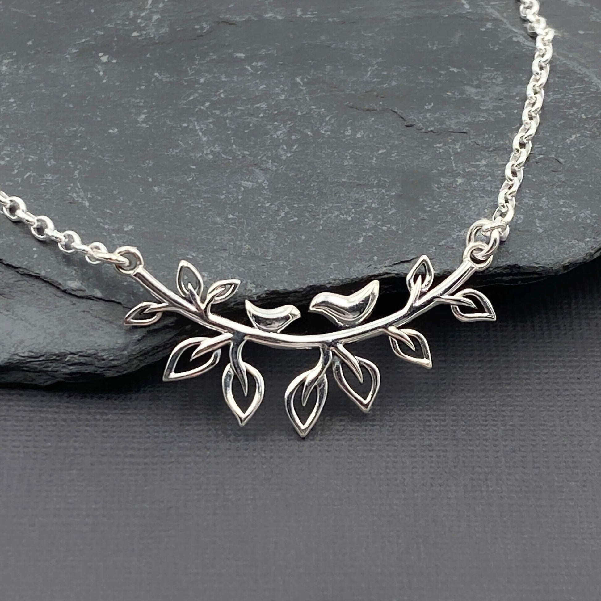This cute Two Birds on a Branch necklace in 925 solid sterling silver comes on a 925 solid sterling silver sturdy Rolo chain in multiple chain lengths. The two sparrow birds symbolize nurturing and family and is a perfect gift from daughter to mother.